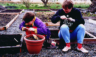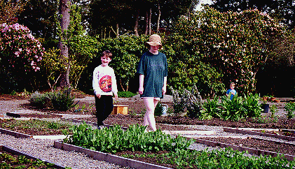 Vegetables as Landscaping (THIS PAGE UNDER CONSTRUCTION) Doreen with the first planting Kim and Trevor admire their work. Jordan looks on in the background. Doreen and Trevor prepare labels for his vegetable box. © 2001 by John and Doreen Anderson