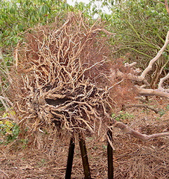 Rhododendrons have a compact, shallow root mass. The entire system on this 10-foot high plant was less that a foot deep. Notice how flattened the tap root is. The branching roots grow slightly upward from there, giving the root ball its typical rhododendron saucer shape. It is easy to see why rhododendrons benefit so much from mulch to keep the roots moist and cool. A winter windstorm uprooted this rhododendron and it never recovered. I used a pressure washer to remove the dirt while leaving even the hairline roots intact. |