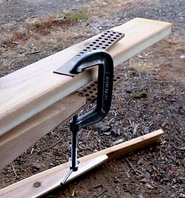 I made the curved railing from 5/4 cedar decking. I cut an eight-foot piece of 1x4 in an arc, four inches thick at the middle and one inch at each end. Then I attached a ten-foot piece to it at the middle, adding screws out toward the ends until it wouldn't bend anymore. For the final curve, I used clamps. The finished other railing lies on the ground. The eight-foot pieces fit between the bridge uprights, while the ten-foot rails extend over them. |