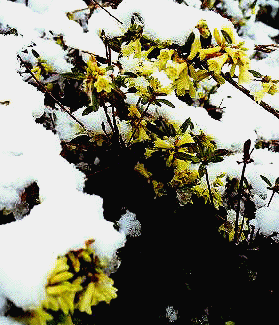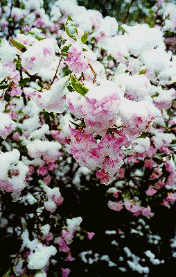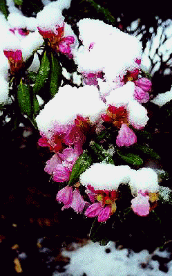 Spring Snow on Three Blooming Rhododendrons