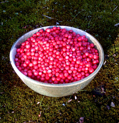 Lingonberries make a dense, evergreen mound in the herb garden. They are about the size of beebies, so picking is slow. Lingonberry combs are available for harvesting, but they gather the stems and sticks, as well as unripe berries. Lingonberries are native to Scandinavia and popular in many recipes there. Below are a bowl with about two cups of berries, and a lingonberry-apple cake. |