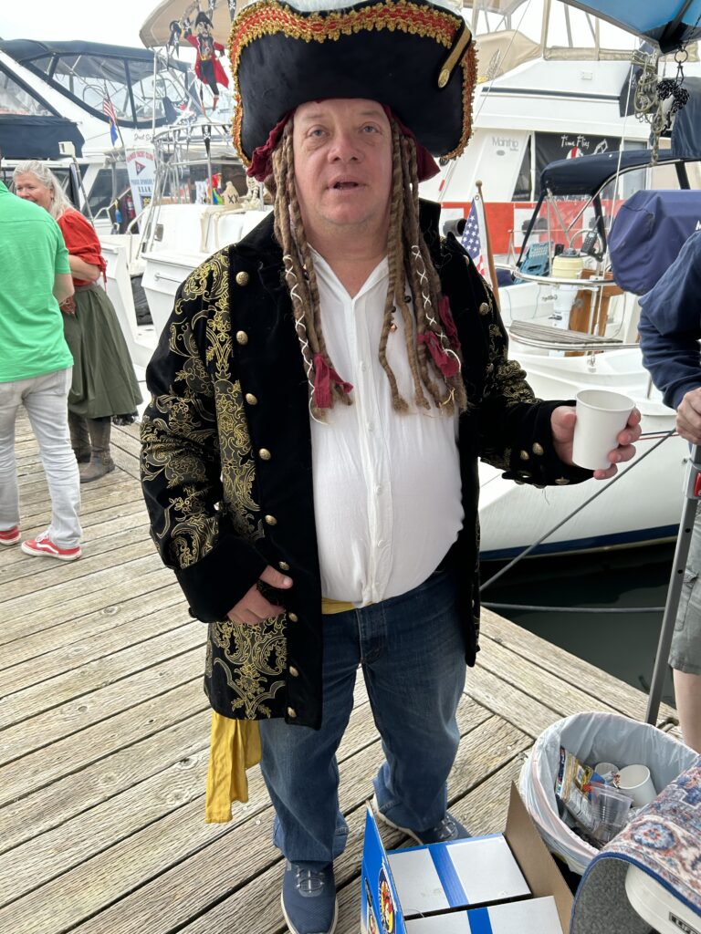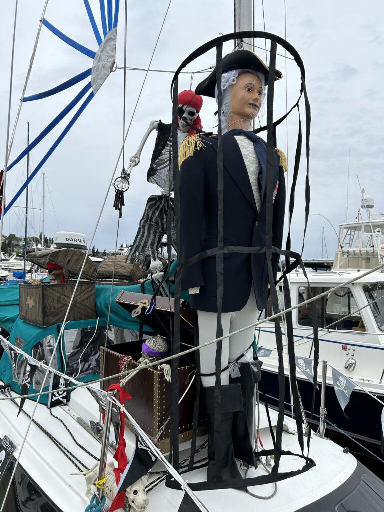 Impromptu musical gams—musicians drifting between docks and boats with guitars, fiddles, or brass, or bands gathering on a stern deck—emerge as crews relax after long days of decorating, practicing parade maneuvers, and rigging their boats to match the year’s theme.