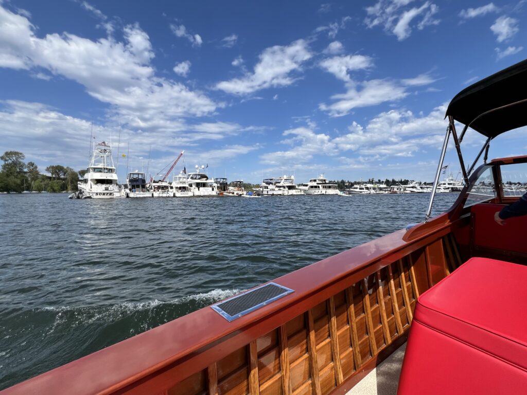 Throughout the days, a log boom is established in Lake Washington near the Montlake Cut, where powerboats and sailboats raft up to create a floating grandstand that will later watch the Windermere Cup races and the parade itself.